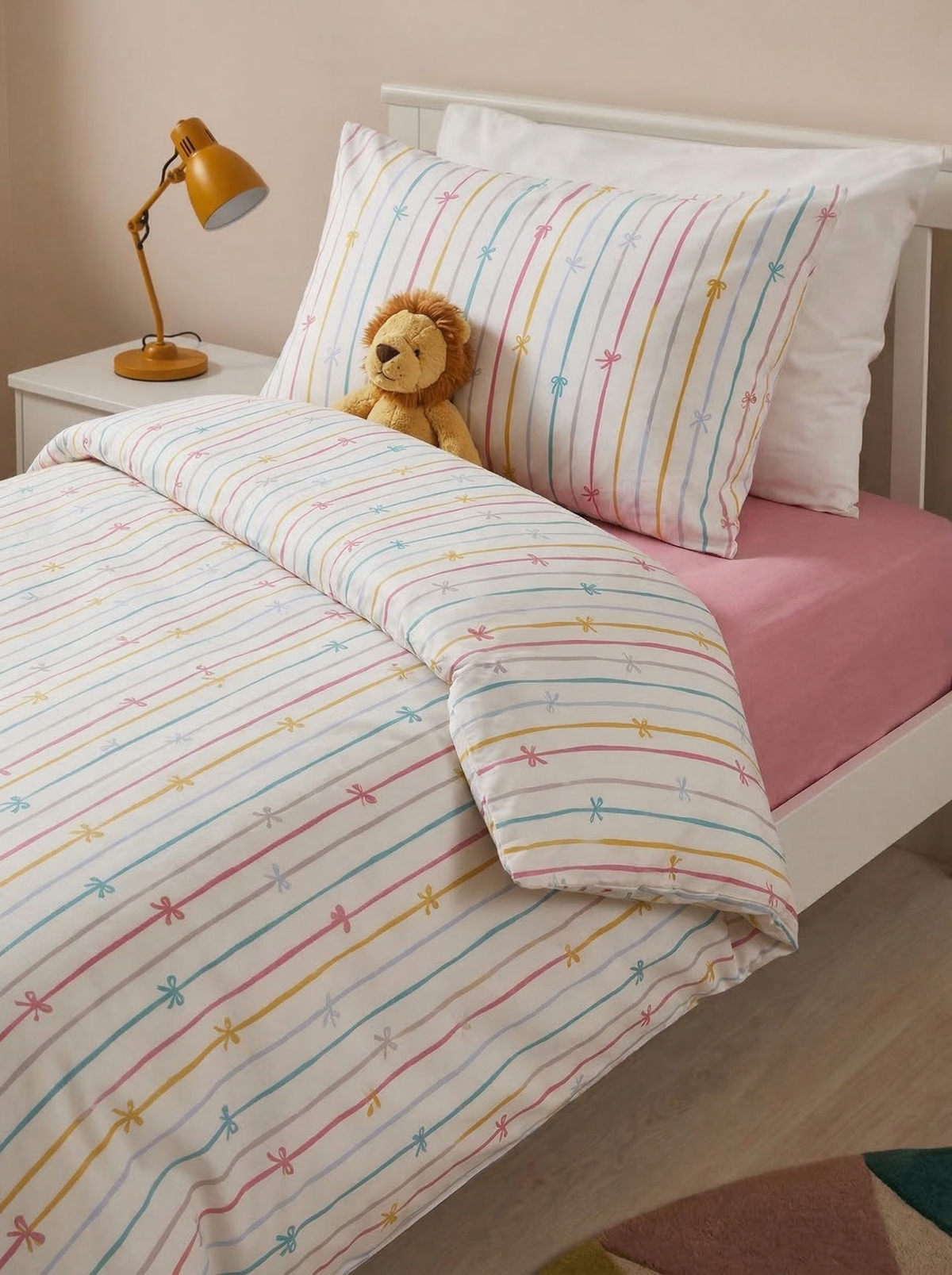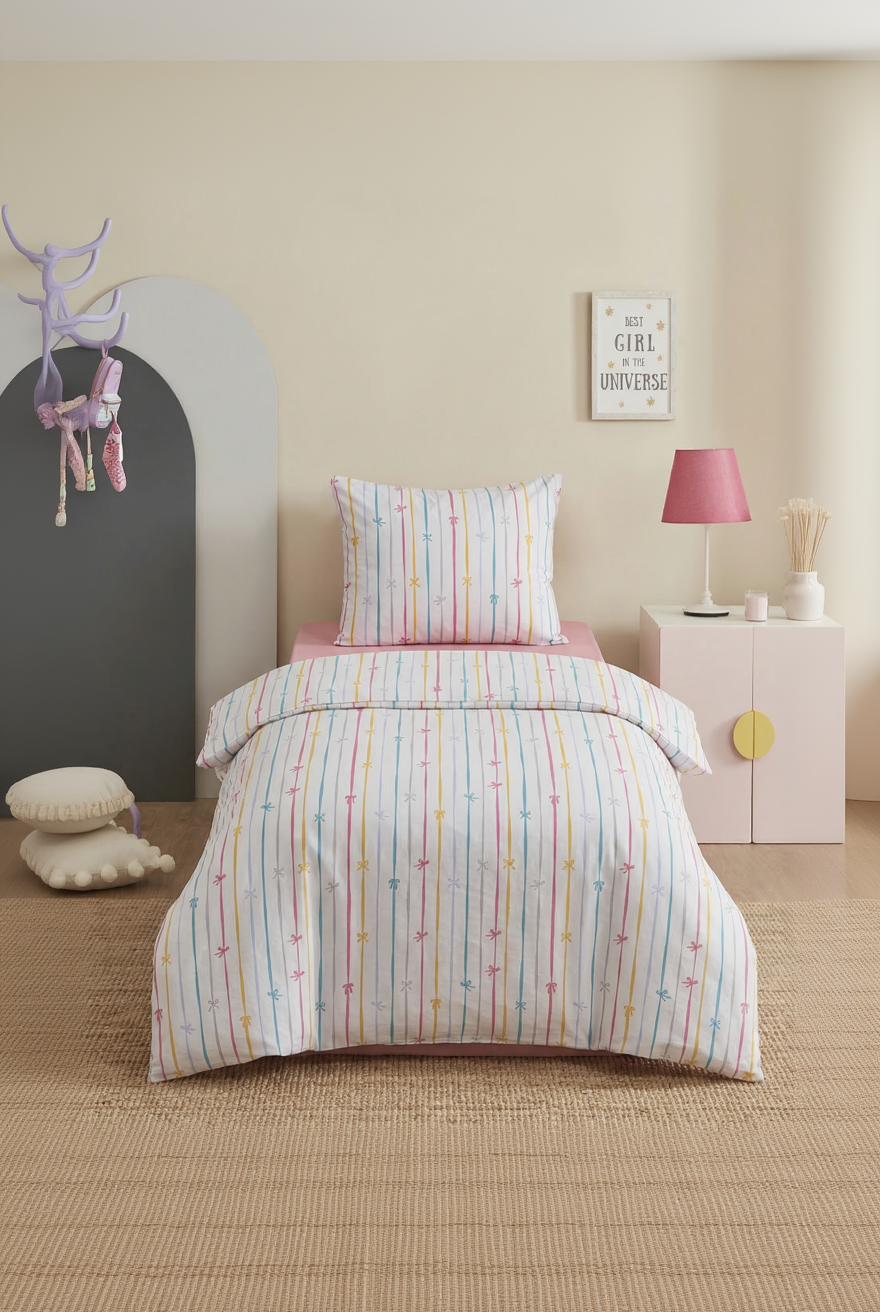 Fiyonk Tek Kişilik Nevresim Takımı, pastel tonlarda çizgili ve zarif fiyonk desenleriyle yatak odalarına modern ve ferah bir görünüm kazandırır. Şık tasarımı sayesinde özellikle genç ve çocuk odaları için dekoratif bir atmosfer oluşturur.